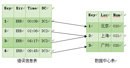 在 上面的例子中,数据库用来存储错误日志信息。每个错误记录(表1中的一行)由3部分组成:错误号ERR,错误发生的时间TIME,和错误发生的数据中心 DC。为了避免重复记录所有的错误记录的数据中心信息,现在每条错误记录将都指向表2(数据中心信息)中的对应的地点那一条记录。这样就不需要实际存储具 体的DC信息在表1中,需要使用时只要到对应的表2行获取就可以了。